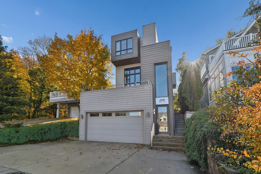 1909 Lake Shore Drive, Long Beach - Stunning 4-Level Mid-Century Home with Lake Michigan Views This exceptional 4-level home offers a perfect blend of mid-century design and modern luxury. Located just steps from the beach, it features breathtaking views of Lake Michigan The ground level includes a 2-car garage with direct access, while the main living level boasts a sunny living room leading out to a 20-foot deck, a large family room with fireplace, and a chef's kitchen with custom Berch cabinets and an eat-in area. Upstairs, you'll find two master bedrooms, and two additional bedrooms. The top level is a fantastic loft bedroom with floor to ceiling windows and a private deck. The home is fully updated and includes a convenient elevator serving all levels. Don't miss this unique opportunity to own a piece of architectural excellence exclusively designed by Bamesbeger Architecture.