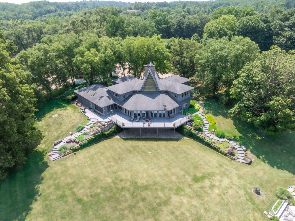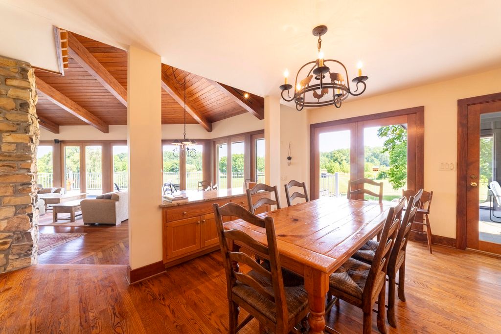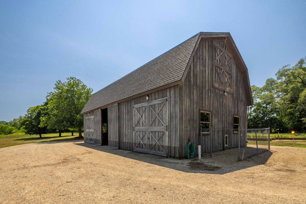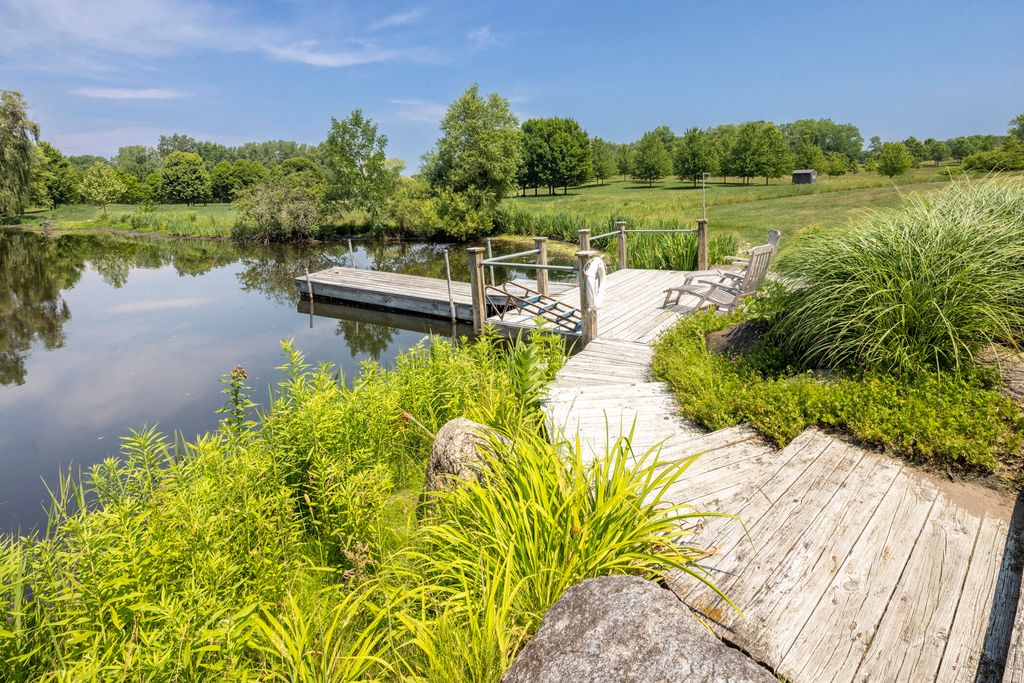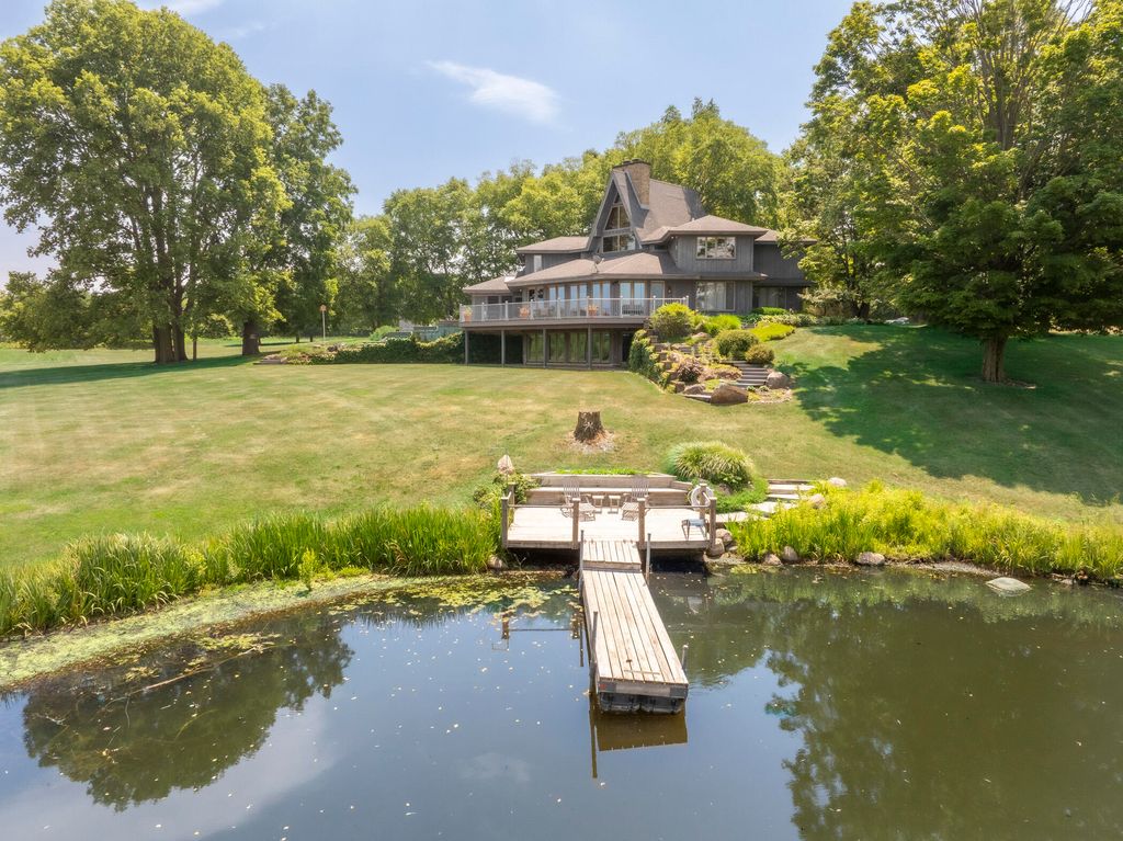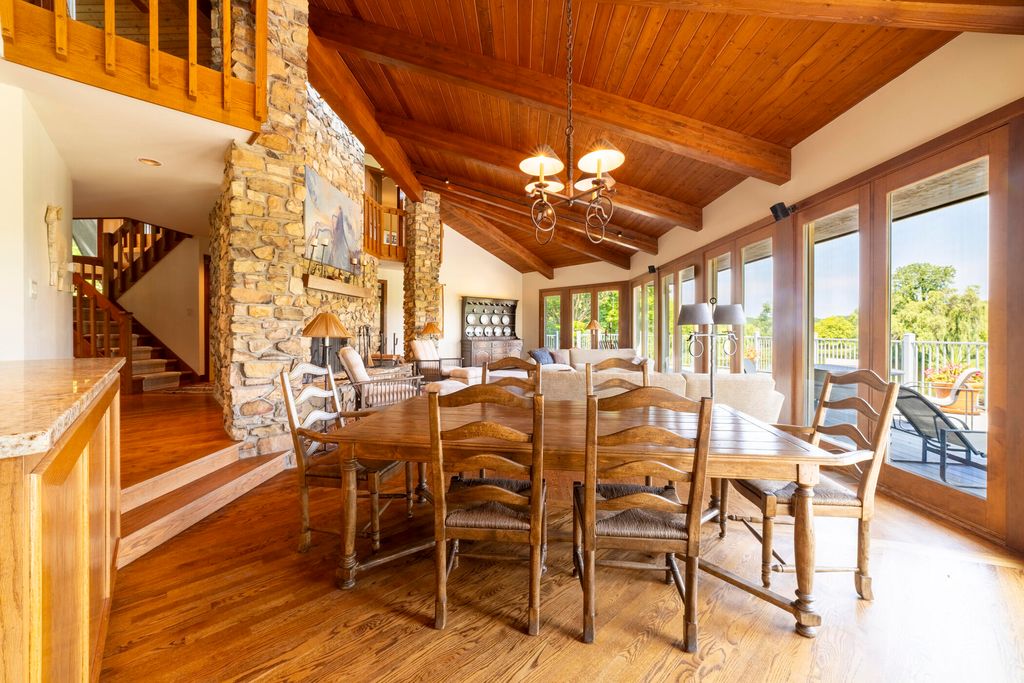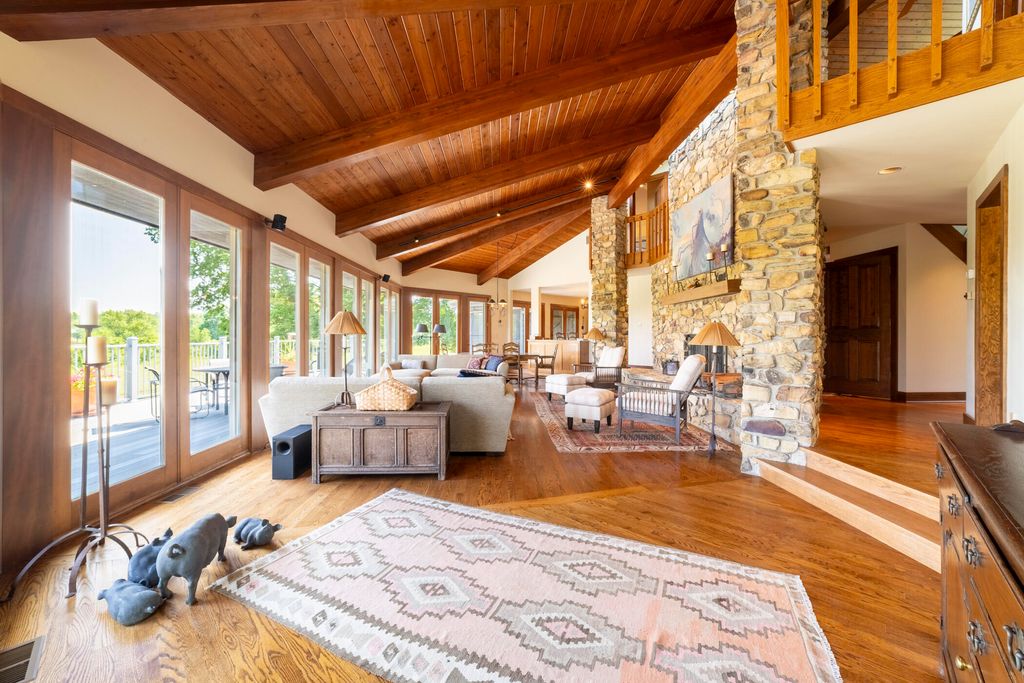 Welcome to a perfectly private rustic retreat set on 97 serene acres in the coveted corridor of Galena Township. This remarkable estate offers five spacious bedrooms and four bathrooms, blending timeless style, modern comfort, and the beauty of its natural surroundings. The moment you enter, you are met with a soaring cathedral ceiling and a striking wooden staircase that sets the tone for the home's inviting warmth. The open-concept kitchen, dining, and living areas feature tongue-and-groove vaulted ceilings and a dramatic floor-to-ceiling stone fireplace, while a wall of French doors floods the space with natural light and leads to a sunroom and wraparound deck. From here, enjoy the sweeping views of a tranquil pond and lush tree farm creating an atmosphere perfect for both everyday living and unforgettable gatherings. The gourmet kitchen is a chef's dream, with shaker cabinetry, granite countertops, generous island, and a dedicated coffee bar. Beautiful hardwood floors flow throughout, enhancing the home's sense of cohesion. The main level also offers a convenient laundry room, while additional living spaces include a billiards room and a cozy sitting area with custom bookshelves. The walkout basement is a showstopper in its own right, anchored by another floor-to-ceiling fireplace and framed by French doors and expansive windows that bring the outdoors in. Beyond the home, a classic timber-and-peg barn stands ready for its next chapter--whether as a guesthouse, event venue, workshop, or studio. The property, meticulously maintained and irrigated, could easily return to a working farm. Mature trees, scenic walking trails, and a peaceful pond with a dock offer endless opportunities for outdoor recreation and quiet reflection. Combining rustic charm with modern amenities and boundless potential, this is more than just a property, it is a place where memories are made, nature is cherished, and the possibilities are as vast as the land itself.