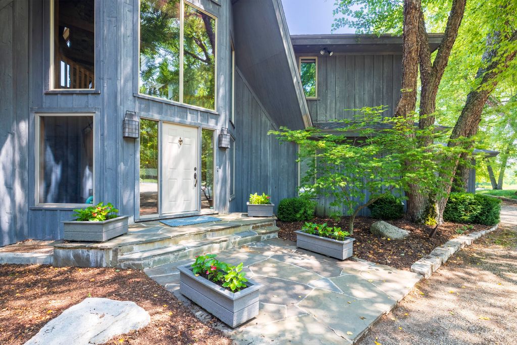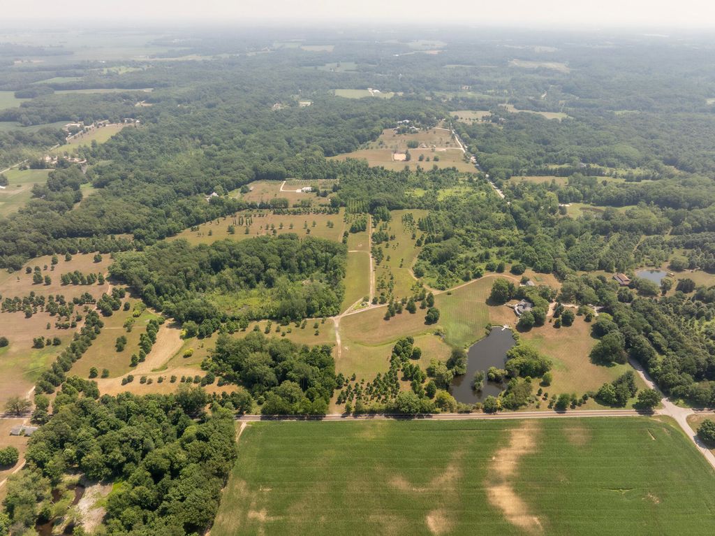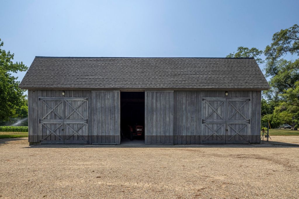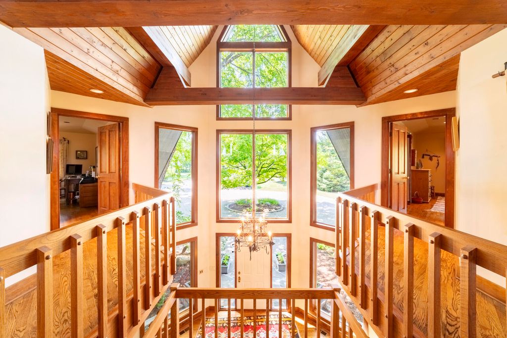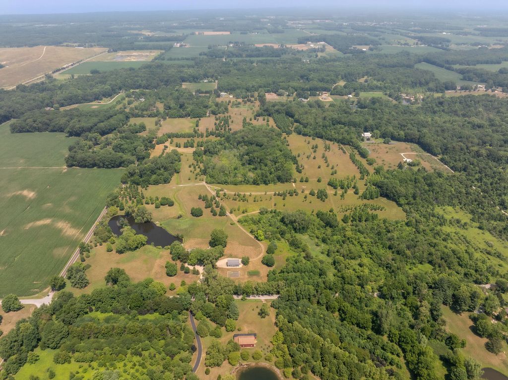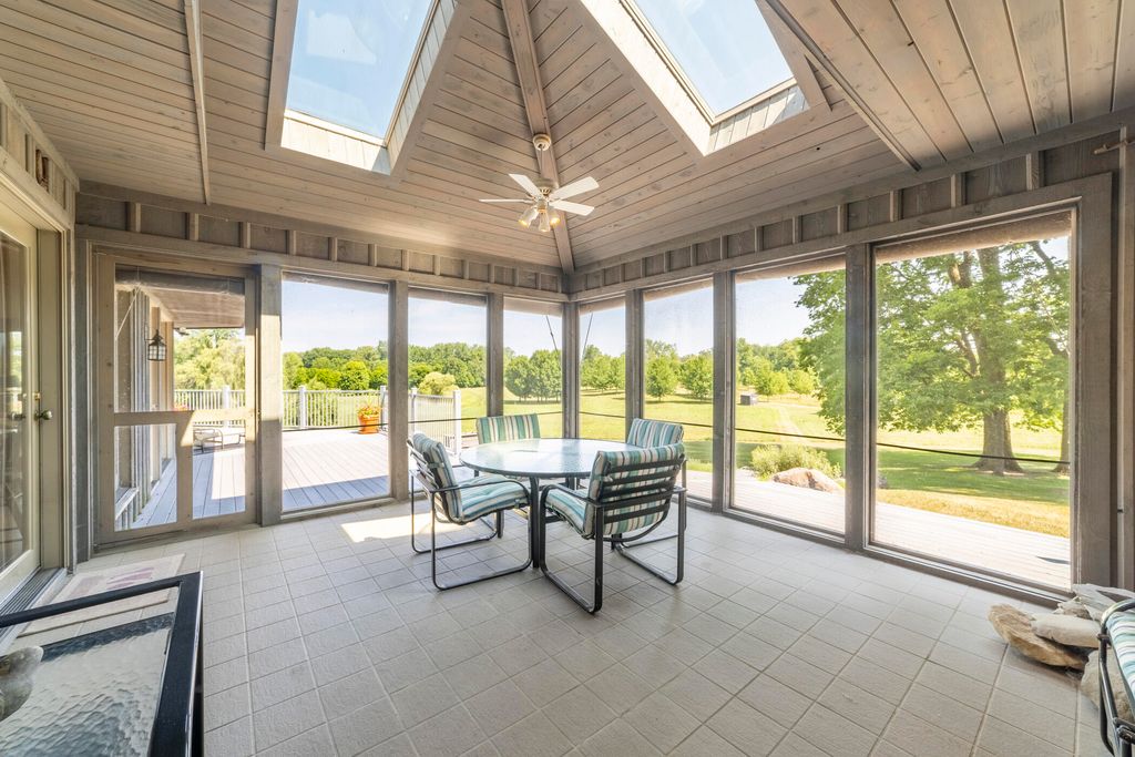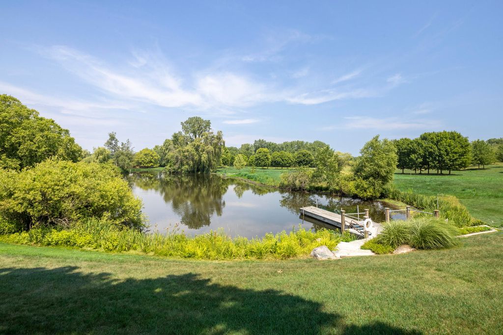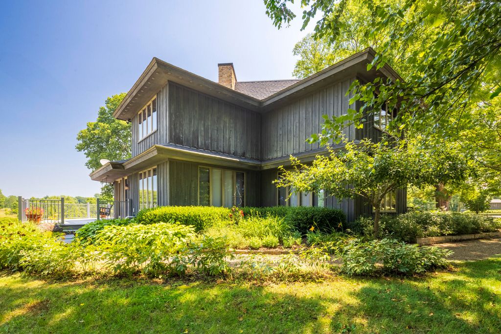 Welcome to a perfectly private rustic retreat set on 97 serene acres in the coveted corridor of Galena Township. This remarkable estate offers five spacious bedrooms and four bathrooms, blending timeless style, modern comfort, and the beauty of its natural surroundings. The moment you enter, you are met with a soaring cathedral ceiling and a striking wooden staircase that sets the tone for the home's inviting warmth. The open-concept kitchen, dining, and living areas feature tongue-and-groove vaulted ceilings and a dramatic floor-to-ceiling stone fireplace, while a wall of French doors floods the space with natural light and leads to a sunroom and wraparound deck. From here, enjoy the sweeping views of a tranquil pond and lush tree farm creating an atmosphere perfect for both everyday living and unforgettable gatherings. The gourmet kitchen is a chef's dream, with shaker cabinetry, granite countertops, generous island, and a dedicated coffee bar. Beautiful hardwood floors flow throughout, enhancing the home's sense of cohesion. The main level also offers a convenient laundry room, while additional living spaces include a billiards room and a cozy sitting area with custom bookshelves. The walkout basement is a showstopper in its own right, anchored by another floor-to-ceiling fireplace and framed by French doors and expansive windows that bring the outdoors in. Beyond the home, a classic timber-and-peg barn stands ready for its next chapter--whether as a guesthouse, event venue, workshop, or studio. The property, meticulously maintained and irrigated, could easily return to a working farm. Mature trees, scenic walking trails, and a peaceful pond with a dock offer endless opportunities for outdoor recreation and quiet reflection. Combining rustic charm with modern amenities and boundless potential, this is more than just a property, it is a place where memories are made, nature is cherished, and the possibilities are as vast as the land itself.