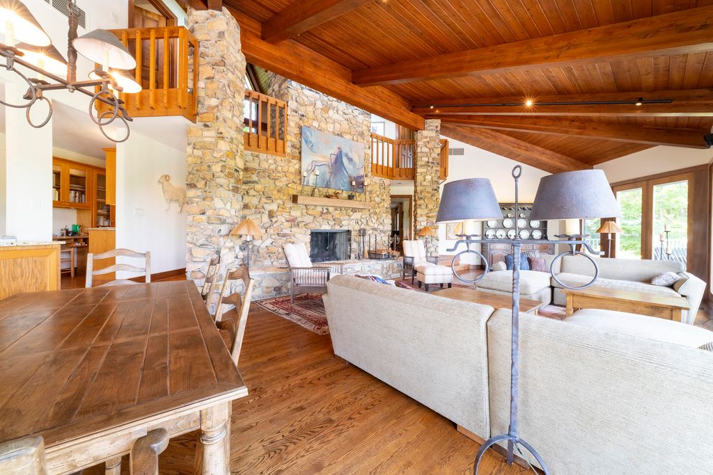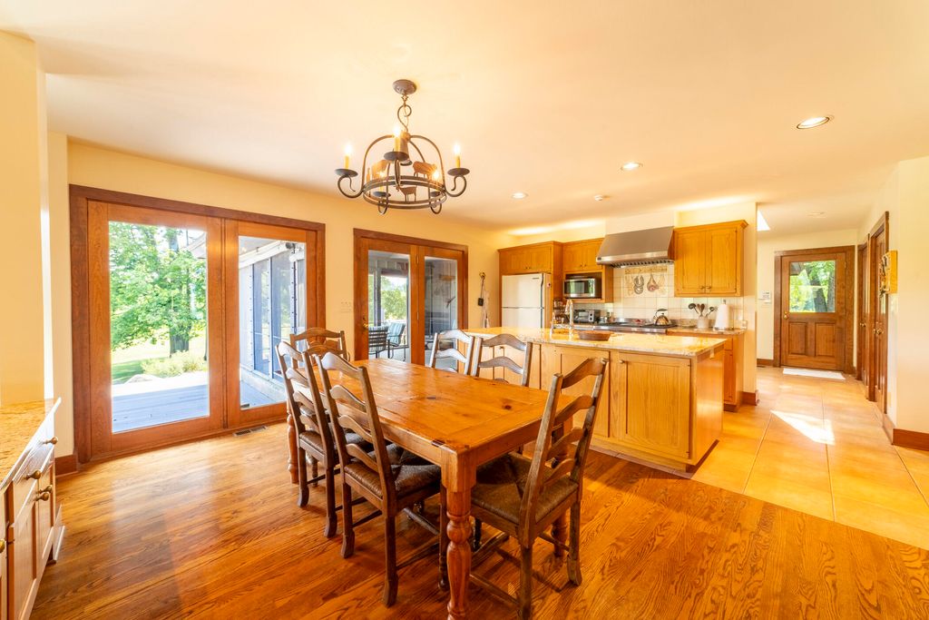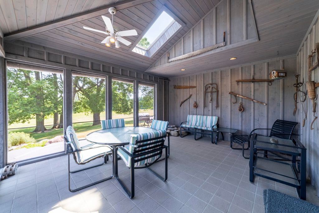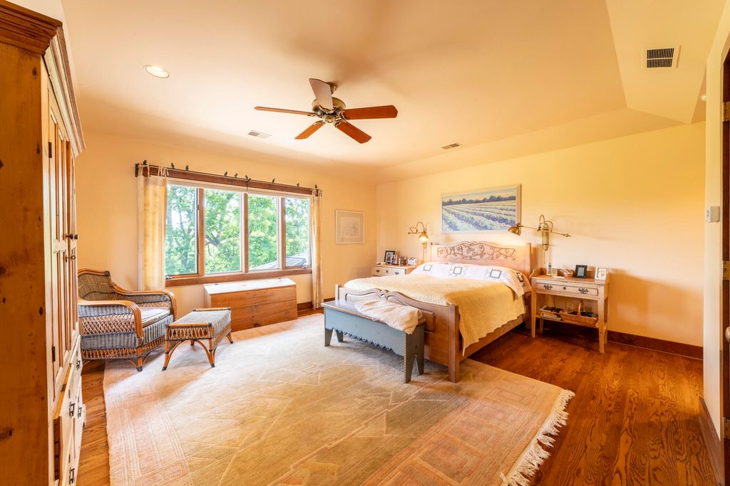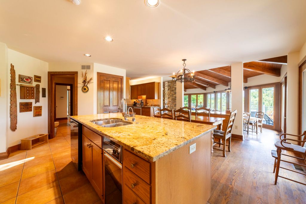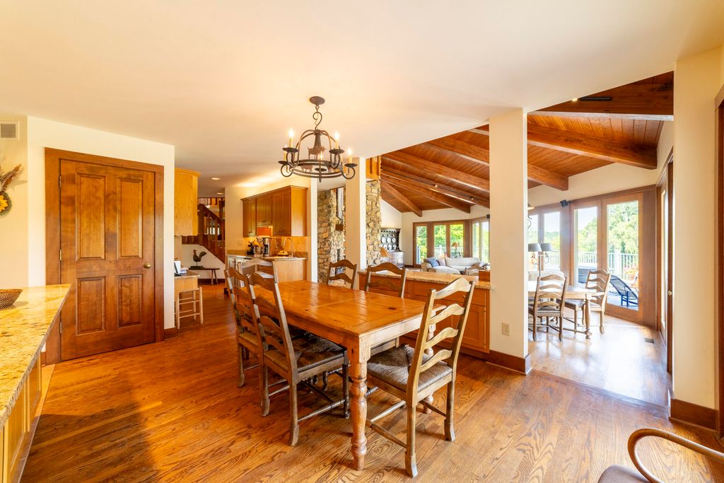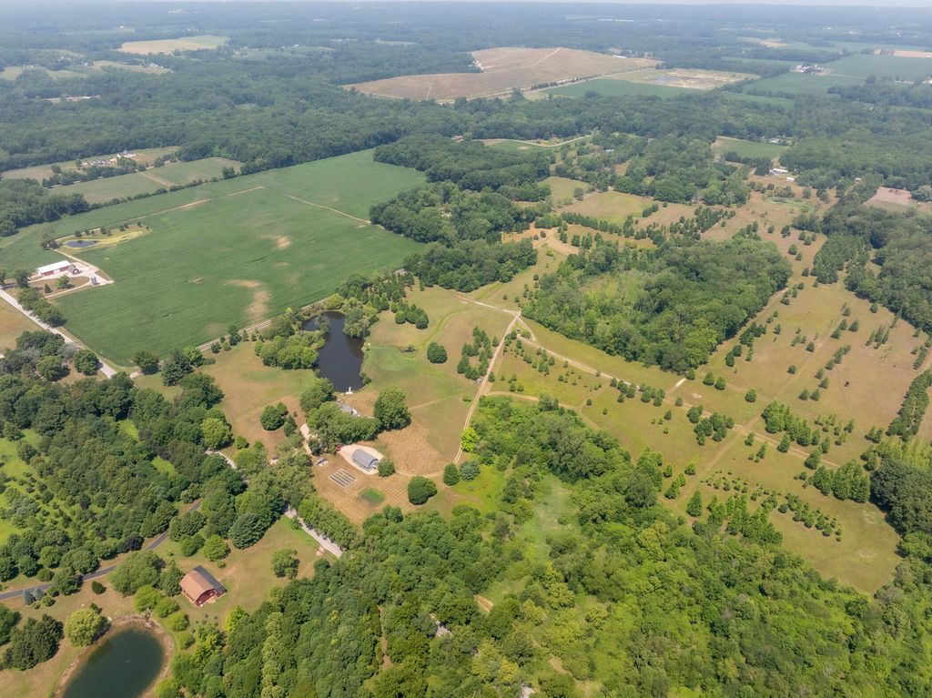 Welcome to a perfectly private rustic retreat set on 97 serene acres in the coveted corridor of Galena Township. This remarkable estate offers five spacious bedrooms and four bathrooms, blending timeless style, modern comfort, and the beauty of its natural surroundings. The moment you enter, you are met with a soaring cathedral ceiling and a striking wooden staircase that sets the tone for the home's inviting warmth. The open-concept kitchen, dining, and living areas feature tongue-and-groove vaulted ceilings and a dramatic floor-to-ceiling stone fireplace, while a wall of French doors floods the space with natural light and leads to a sunroom and wraparound deck. From here, enjoy the sweeping views of a tranquil pond and lush tree farm creating an atmosphere perfect for both everyday living and unforgettable gatherings. The gourmet kitchen is a chef's dream, with shaker cabinetry, granite countertops, generous island, and a dedicated coffee bar. Beautiful hardwood floors flow throughout, enhancing the home's sense of cohesion. The main level also offers a convenient laundry room, while additional living spaces include a billiards room and a cozy sitting area with custom bookshelves. The walkout basement is a showstopper in its own right, anchored by another floor-to-ceiling fireplace and framed by French doors and expansive windows that bring the outdoors in. Beyond the home, a classic timber-and-peg barn stands ready for its next chapter--whether as a guesthouse, event venue, workshop, or studio. The property, meticulously maintained and irrigated, could easily return to a working farm. Mature trees, scenic walking trails, and a peaceful pond with a dock offer endless opportunities for outdoor recreation and quiet reflection. Combining rustic charm with modern amenities and boundless potential, this is more than just a property, it is a place where memories are made, nature is cherished, and the possibilities are as vast as the land itself.