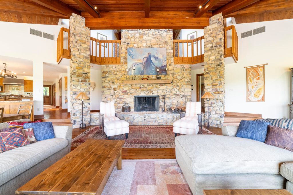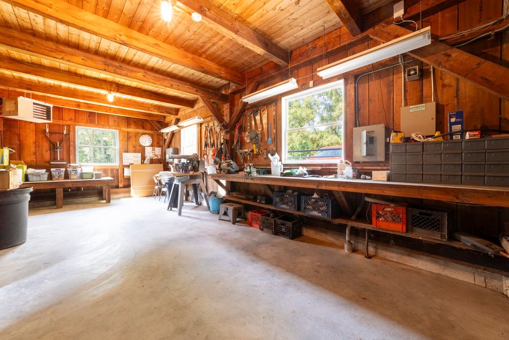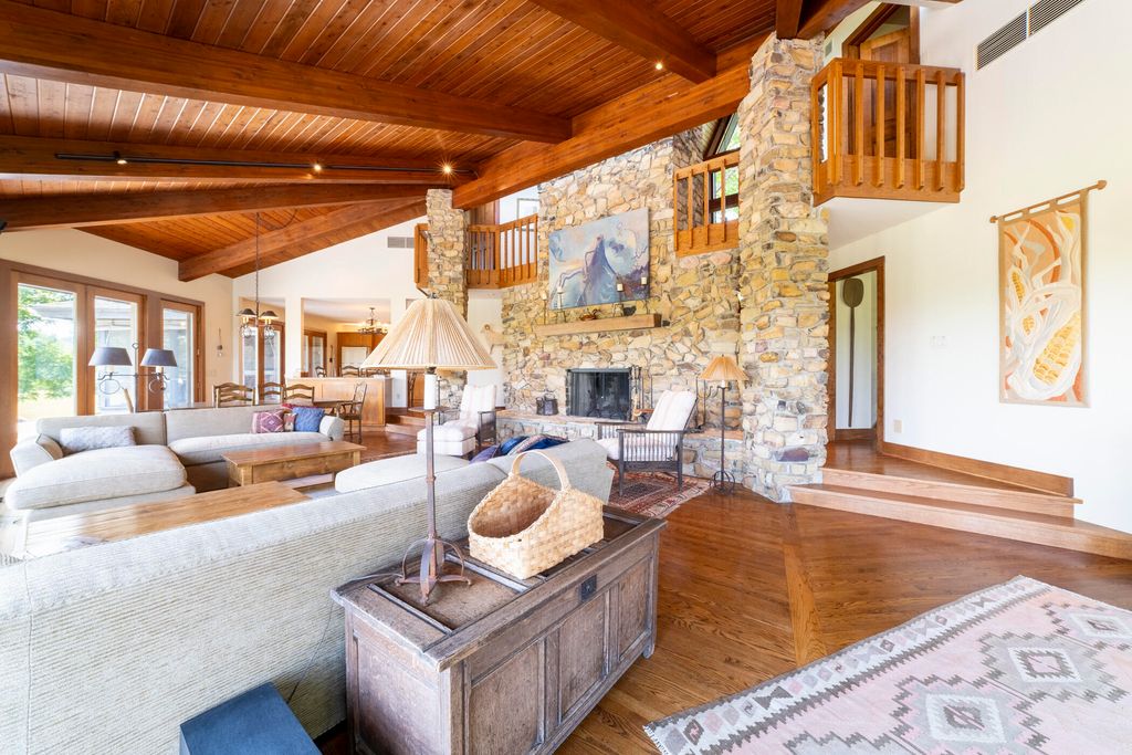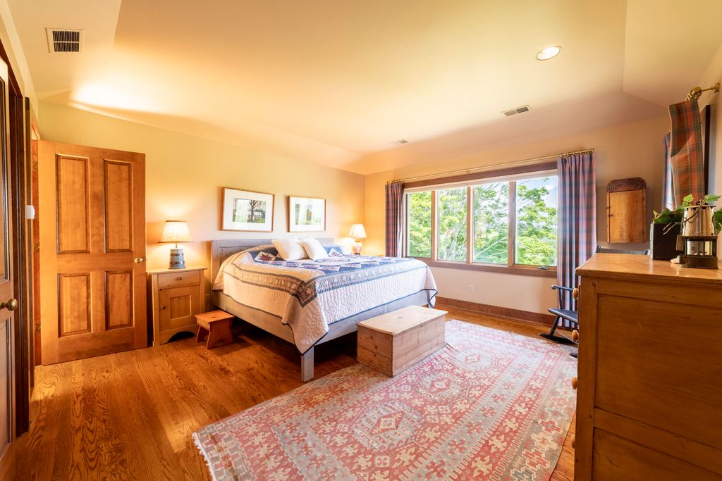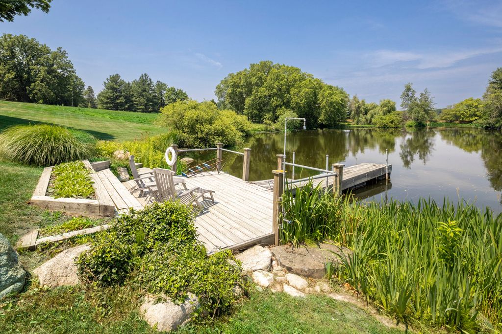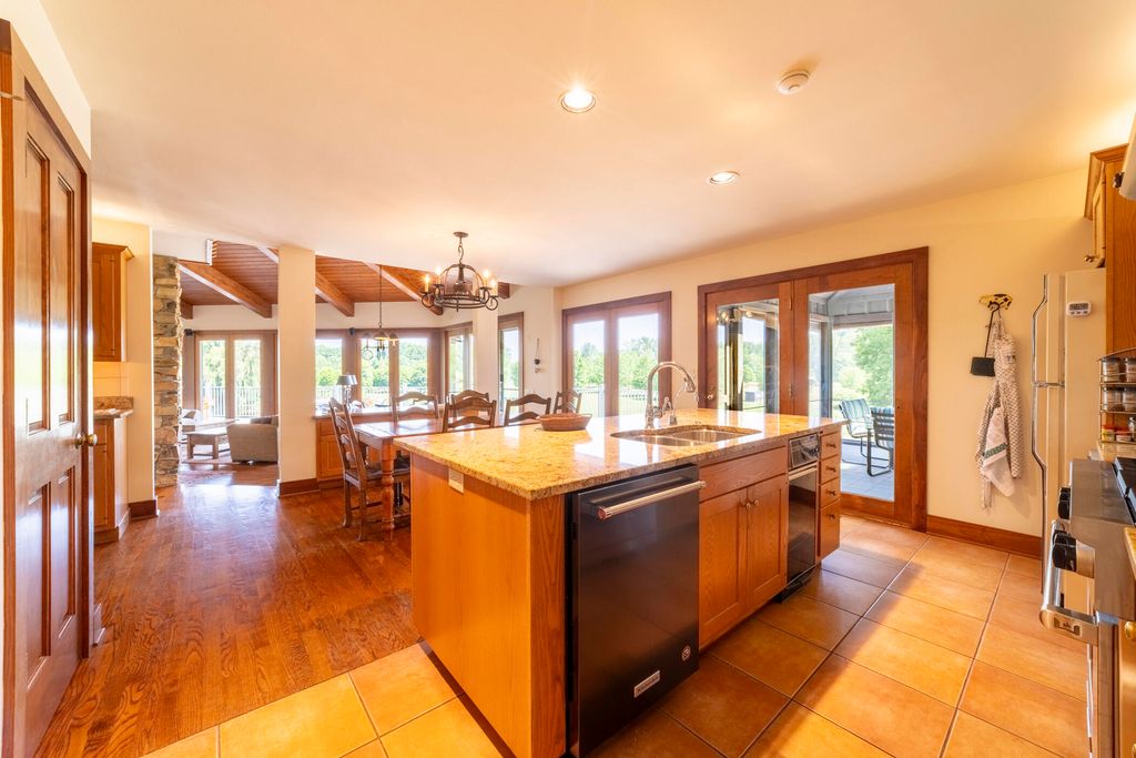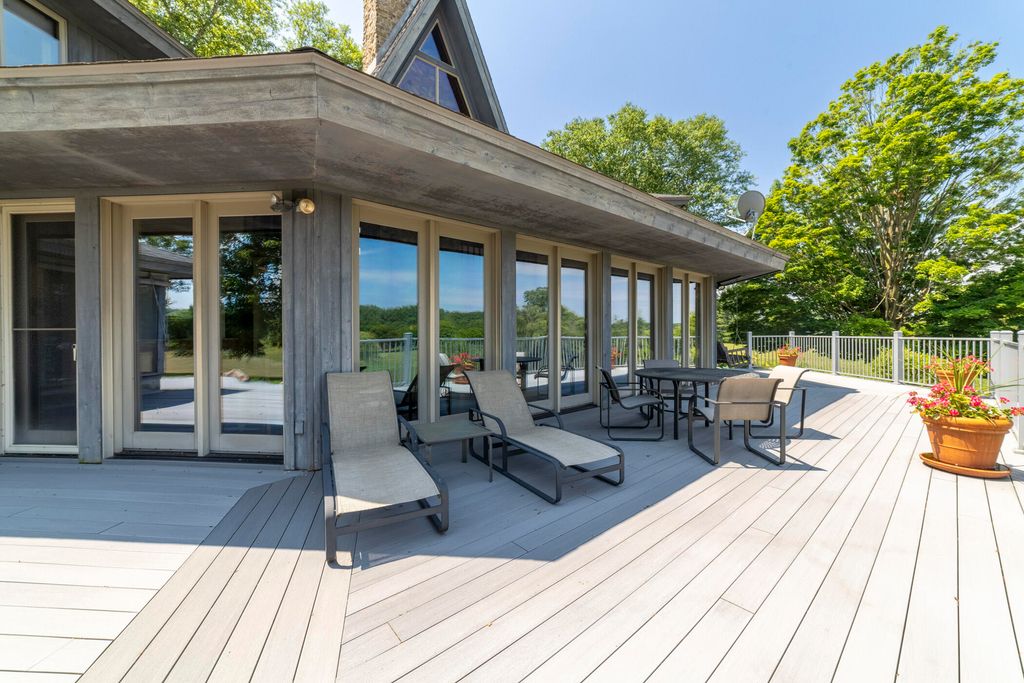 Welcome to a perfectly private rustic retreat set on 97 serene acres in the coveted corridor of Galena Township. This remarkable estate offers five spacious bedrooms and four bathrooms, blending timeless style, modern comfort, and the beauty of its natural surroundings. The moment you enter, you are met with a soaring cathedral ceiling and a striking wooden staircase that sets the tone for the home's inviting warmth. The open-concept kitchen, dining, and living areas feature tongue-and-groove vaulted ceilings and a dramatic floor-to-ceiling stone fireplace, while a wall of French doors floods the space with natural light and leads to a sunroom and wraparound deck. From here, enjoy the sweeping views of a tranquil pond and lush tree farm creating an atmosphere perfect for both everyday living and unforgettable gatherings. The gourmet kitchen is a chef's dream, with shaker cabinetry, granite countertops, generous island, and a dedicated coffee bar. Beautiful hardwood floors flow throughout, enhancing the home's sense of cohesion. The main level also offers a convenient laundry room, while additional living spaces include a billiards room and a cozy sitting area with custom bookshelves. The walkout basement is a showstopper in its own right, anchored by another floor-to-ceiling fireplace and framed by French doors and expansive windows that bring the outdoors in. Beyond the home, a classic timber-and-peg barn stands ready for its next chapter--whether as a guesthouse, event venue, workshop, or studio. The property, meticulously maintained and irrigated, could easily return to a working farm. Mature trees, scenic walking trails, and a peaceful pond with a dock offer endless opportunities for outdoor recreation and quiet reflection. Combining rustic charm with modern amenities and boundless potential, this is more than just a property, it is a place where memories are made, nature is cherished, and the possibilities are as vast as the land itself.