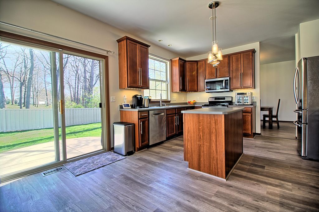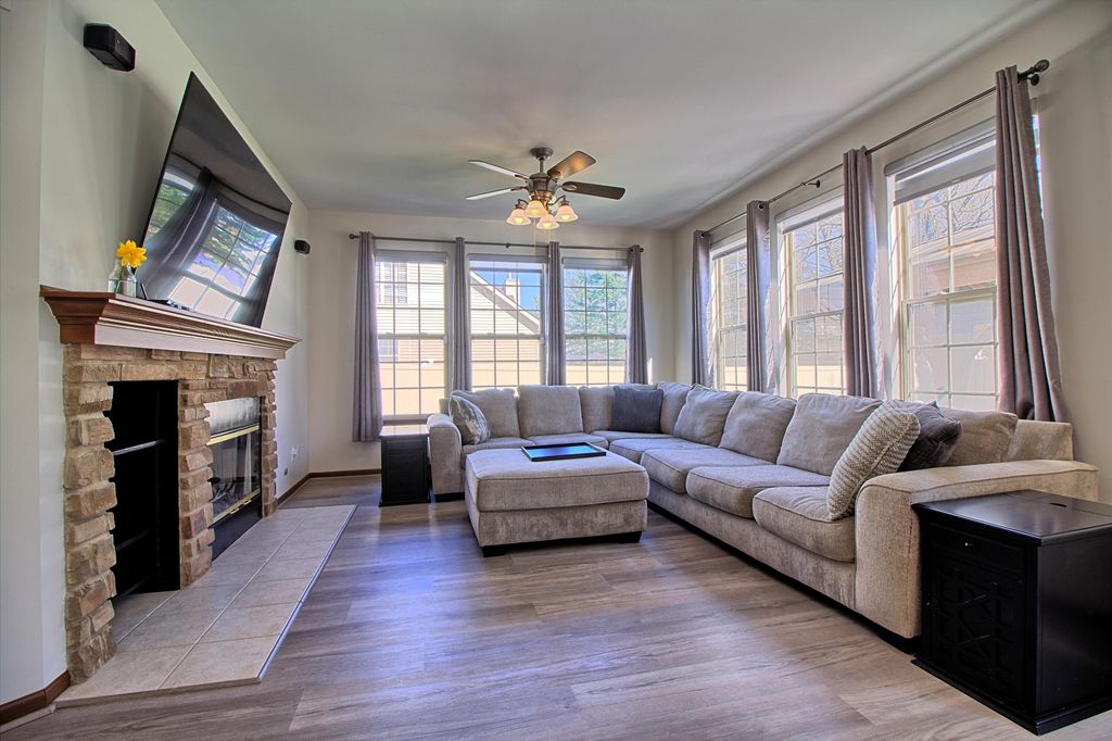 Welcome to this stunning 6-bedroom, 4-bathroom home with over 3,500 square feet of living space, located in the highly desirable Camden Woods neighborhood! This home offers the perfect blend of functionality and style.The main level features an open, flowing layout with an inviting two story foyer, spacious living/dining combo and a large eat-in kitchen that flows into the bright gathering room with a cozy fireplace. A convenient mudroom with laundry hookups and an updated half bathroom add to the ease of everyday living. The main floor bedroom is perfect for flexible living and could also be used as an office or playroom. With 9-foot ceilings throughout, the space feels open and welcoming. Upstairs, you'll find four generously sized bedrooms, including a large primary suite with vaulted ceilings, a walk-in closet, and an en suite bathroom with a soaking tub, separate shower, and water closet. A spacious hallway bathroom serves the other bedrooms.The finished lower level adds even more living space, featuring a huge rec room, laundry room, additional storage, a bedroom, and a beautiful bathroom--perfect for guests or extra living space. The 3-car garage offers plenty of room for storage and vehicles.Step outside to enjoy complete privacy with no neighbors directly behind or on one side. The privacy full fenced backyard, with a patio and pergola, creates a peaceful oasis for relaxation or entertaining.Located near parks, ponds, and Route 30 for easy commuting, this home also boasts a low HOA. This is truly a must-see property!