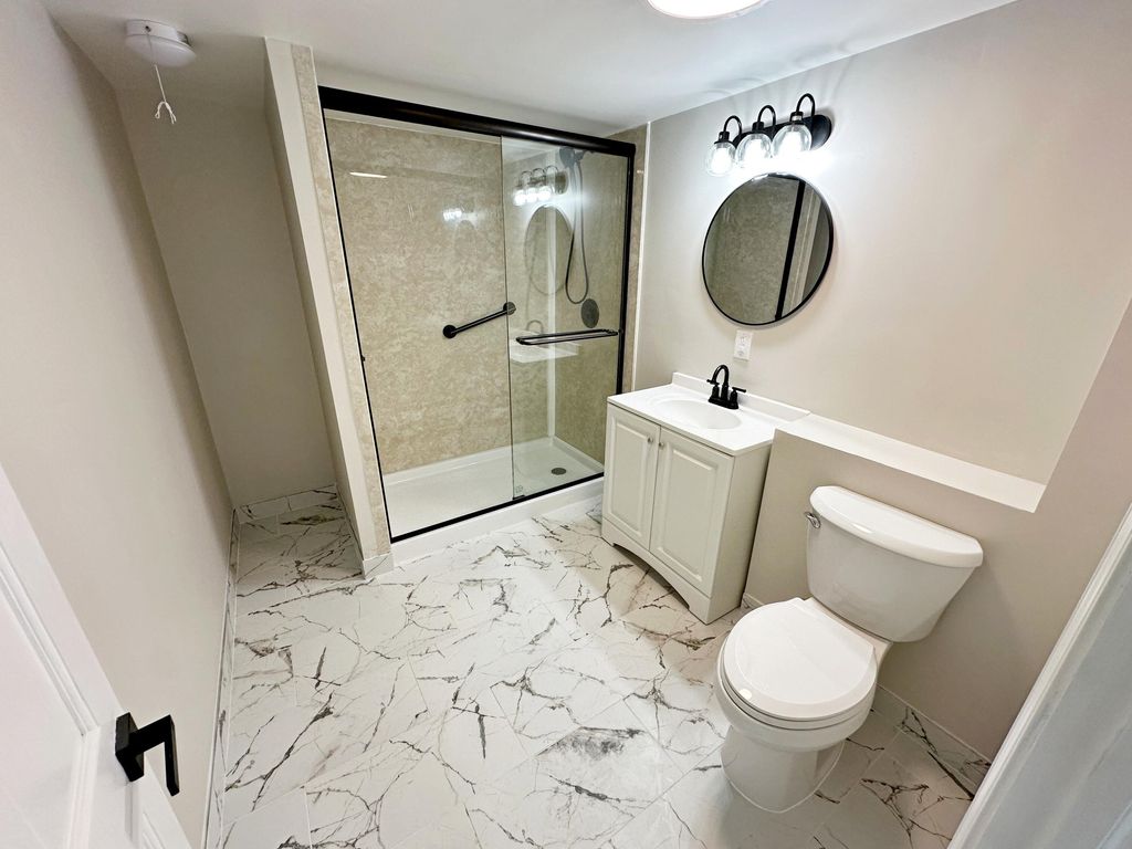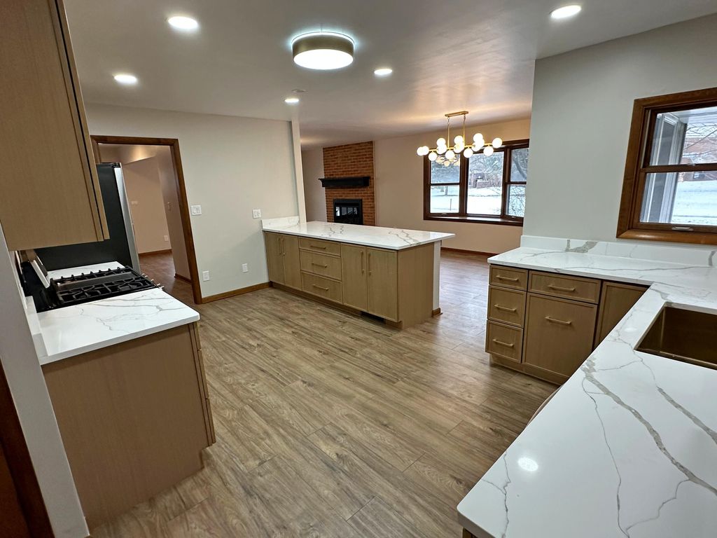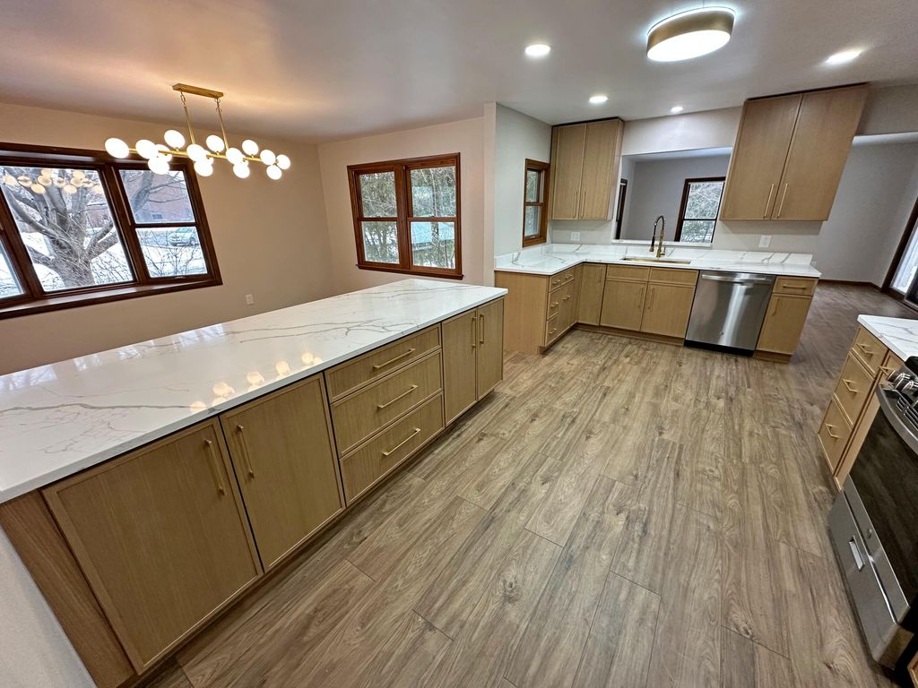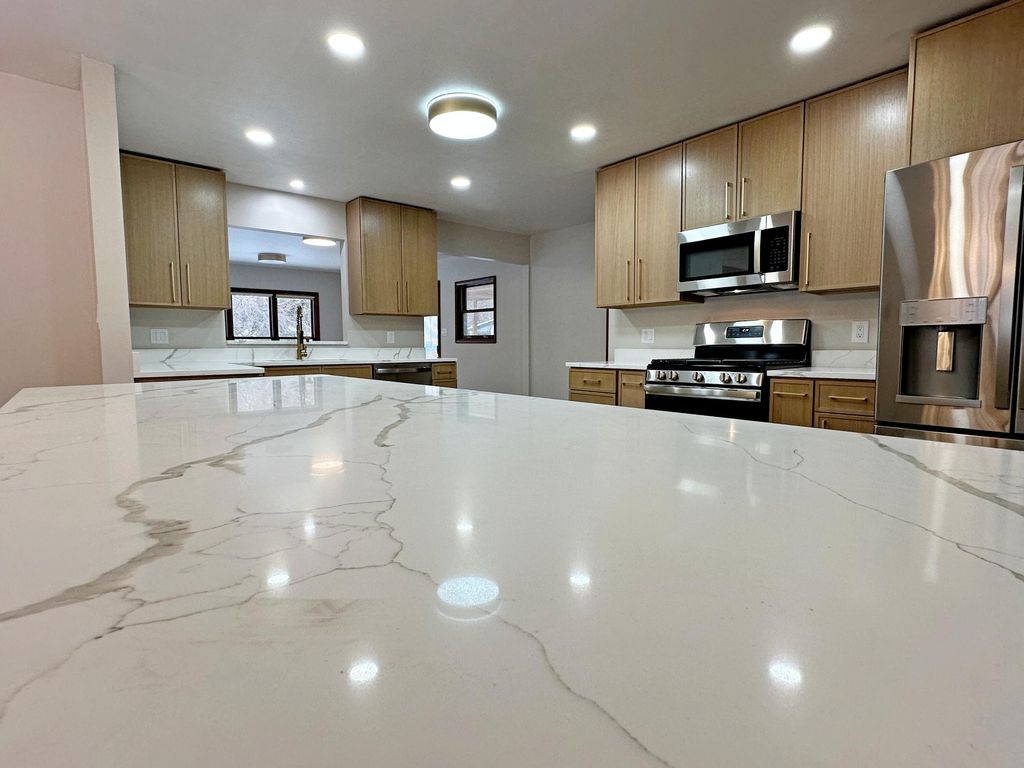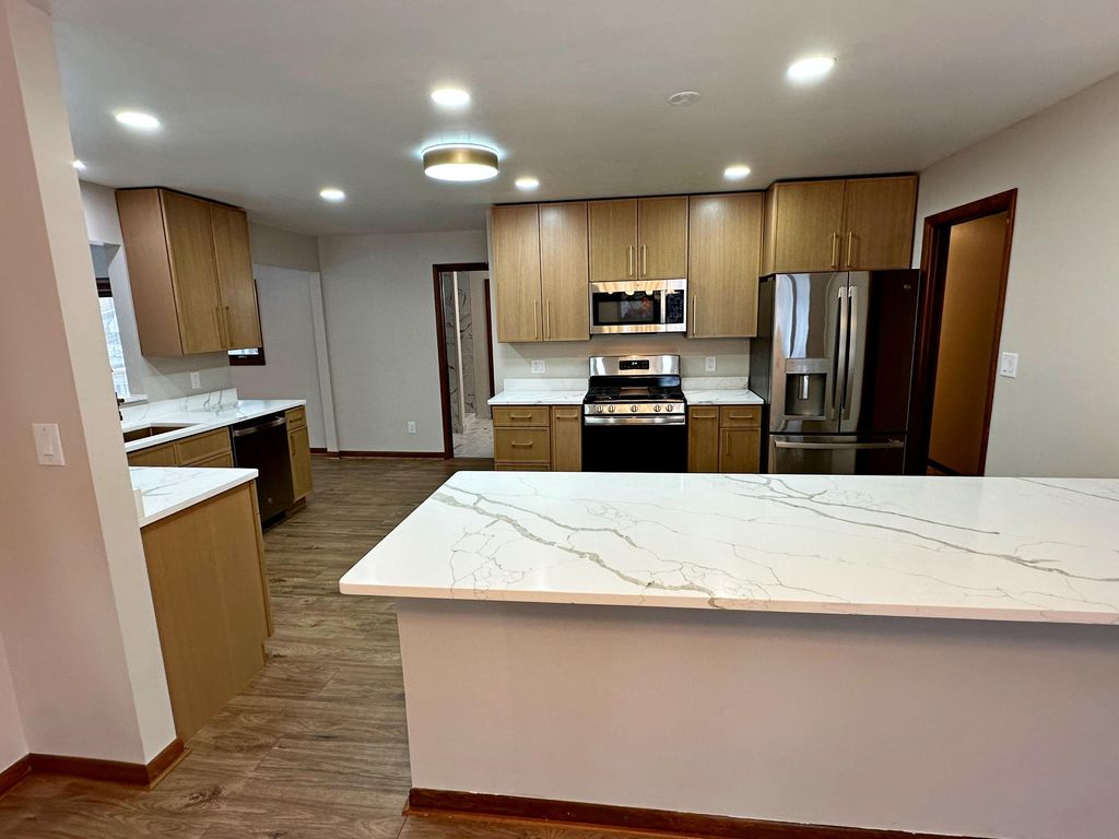 Don't Be Fooled--This Home Is a Showstopper! Over 3,300 finished sq ft. Beautifully renovated and impressively spacious, this 5 bedroom, 3 bath home delivers style, comfort, and versatility at every turn. Luxury vinyl flooring flows throughout the main level, while brand new carpeting adds warmth to the upstairs bedrooms. The grand, open concept kitchen is an entertainer's dream, offering clear sightlines to the living room, dining room, and family room. Enjoy all new cabinetry with elegant gold hardware, quartz countertops, and a massive center island that anchors the space with both beauty and function. The primary suite is a true retreat, featuring a stunning spa inspired bathroom complete with a soaking tub and a standalone shower. The finished lower level expands your living options with two bedrooms, a 3/4 bath, a cozy den, a dedicated laundry room, and a flex room with convenient garage access. Step outside from the family room onto a welcoming deck that overlooks your fenced backyard. Garden beds, trellises, and a charming, whimsical potting shed enhance the peaceful, private setting. This home blends modern updates with inviting character--an exceptional find that feels even better in person.