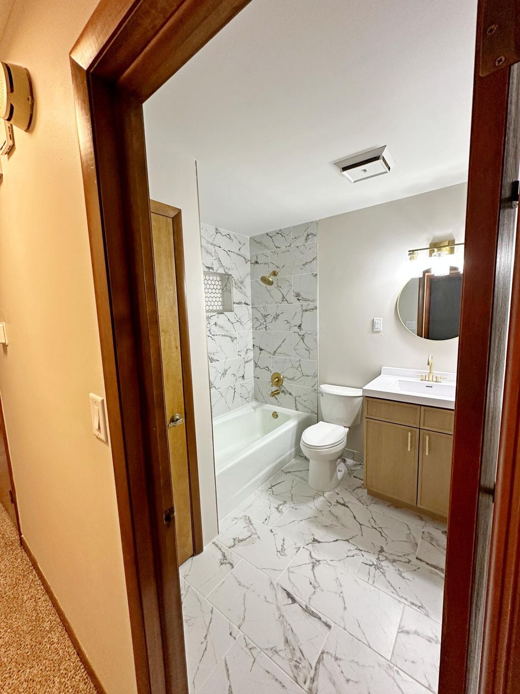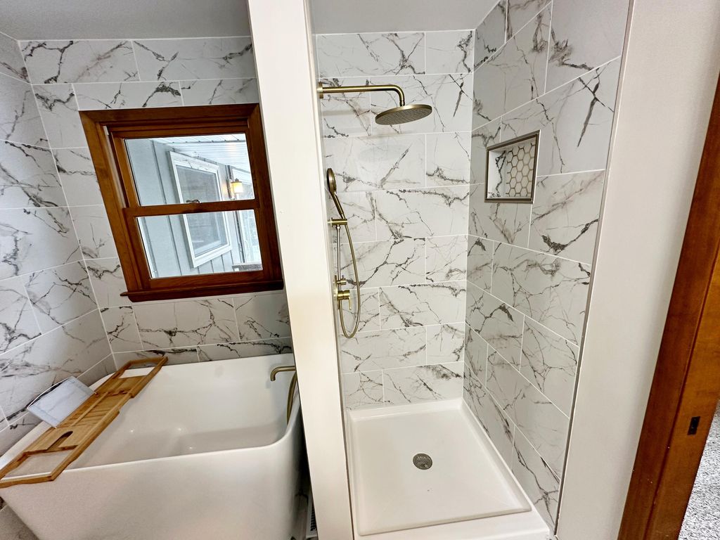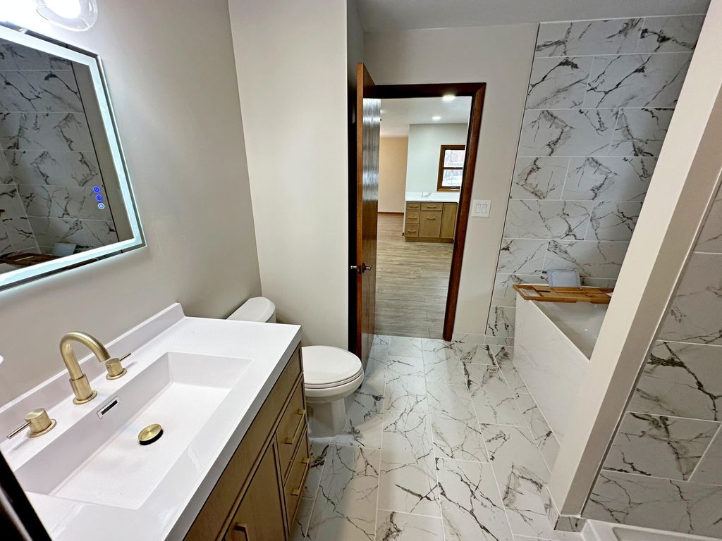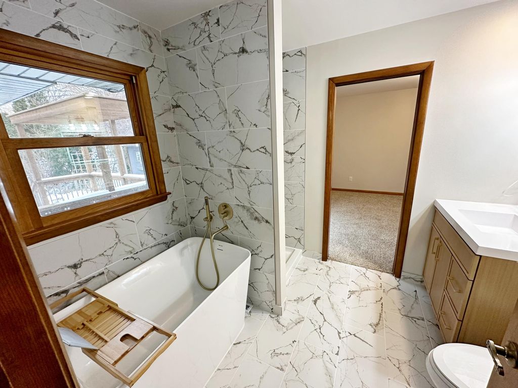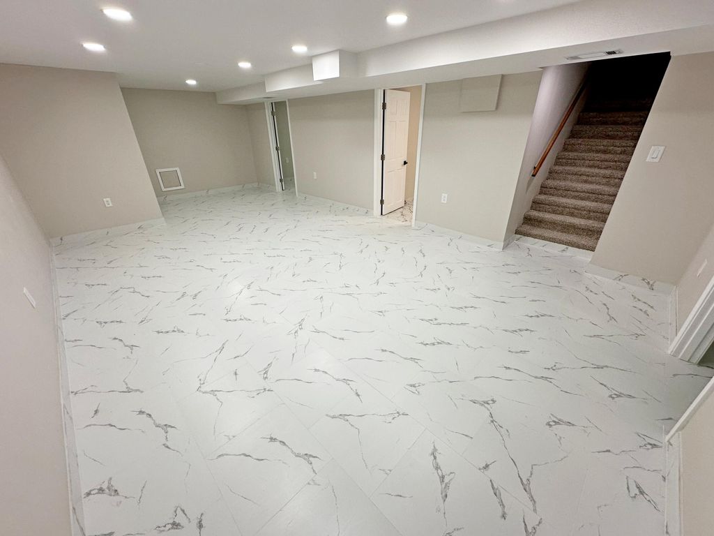 Don't Be Fooled--This Home Is a Showstopper! Over 3,300 finished sq ft. Beautifully renovated and impressively spacious, this 5 bedroom, 3 bath home delivers style, comfort, and versatility at every turn. Luxury vinyl flooring flows throughout the main level, while brand new carpeting adds warmth to the upstairs bedrooms. The grand, open concept kitchen is an entertainer's dream, offering clear sightlines to the living room, dining room, and family room. Enjoy all new cabinetry with elegant gold hardware, quartz countertops, and a massive center island that anchors the space with both beauty and function. The primary suite is a true retreat, featuring a stunning spa inspired bathroom complete with a soaking tub and a standalone shower. The finished lower level expands your living options with two bedrooms, a 3/4 bath, a cozy den, a dedicated laundry room, and a flex room with convenient garage access. Step outside from the family room onto a welcoming deck that overlooks your fenced backyard. Garden beds, trellises, and a charming, whimsical potting shed enhance the peaceful, private setting. This home blends modern updates with inviting character--an exceptional find that feels even better in person.
